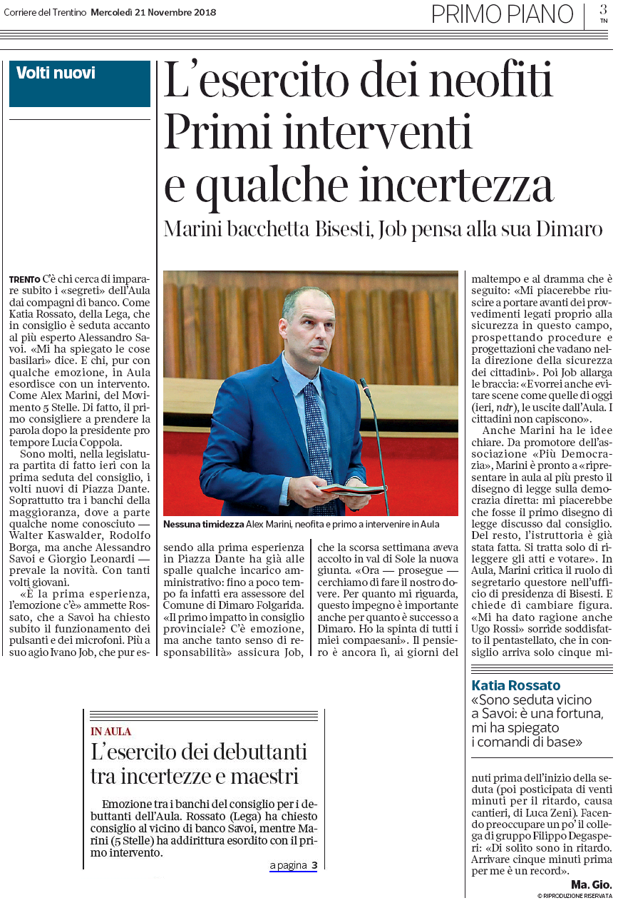 Venerdì 30 novembre ho infine depositato la prima proposta di mozione della legislatura (1/XV – Azioni per rendere effettivo il diritto di voto per corrispondenza da parte degli elettori residenti all’estero iscritti nel registro anagrafico dei cittadini italiani residenti all’estero). Dopo aver ascoltato la relazione del Presidente Fugatti sulle procedure elettorali in ordine al voto del 21 ottobre e dopo aver fatto un primo intervento per evidenziare le criticità relative ai tempi di convalida delle elezioni e di verificare delle condizioni di ineleggibilità, alla norma sulle quote di genere e sull’inefficacia della normativa in materia di voto degli elettori residenti all’estero ho elaborato una proposta per aprire un’istruttoria al fine di affrontare in via la problematica del voto estero e rendere concretamente esigibile un diritto costituzionalmente garantito (Pochi i trentini che votano dall’estero, Marini: “Qui sistema complicato e costoso, copiamo da Bolzano che ha introdotto il voto per corrispondenza” – Il Dolomiti, 30 nov 2018).