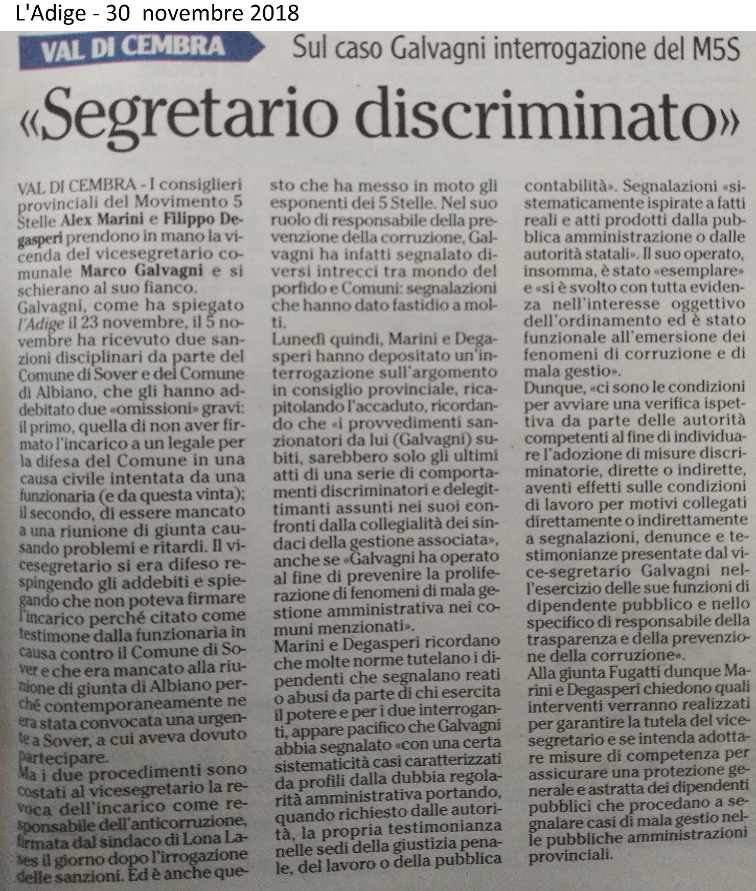 In attesa della nuova convocazione della seconda seduta del Consiglio provinciale ne ho approfittato per iniziare a sollecitare l’esecutivo su temi chiave quali il lavoro, i costi della politica e la tutela dei dipendenti pubblici che denunciano irregolarità all’interno della pubblica amministrazione. Sui tre punti specifici ho presentato tre interrogazioni aventi per oggetto “Misure discriminatorie nei confronti di dipendente pubblico per motivi collegati a segnalazione di illeciti” (86/XVI); “Licenziamento di personale dipendente da parte del Sait” (87/XVI) (Trentino, “M5S torna alla carica”), interrogazione che ha fatto il paio con un’interrogazione presentata da Filippo; e “Sul cumulo del trattamento economico derivante dalla contemporanea copertura di più cariche istituzionali” (88/XVI).