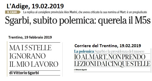 Partiamo dall’annunciata querela. Il sindaco di Sutri contesta uno delle ragioni in base alle quali ritengo “inopportuna” la sua nomina a presidente del Mart di Rovereto. Nei giorni passati in effetti ho sostenuto (qui e qui) che l’asserita affinità politica fra Sgarbi e Fugatti avrebbe potuto indurre al sospetto che la sua nomina derivasse anche da ragioni politiche, circostanza che se confermata a mio avviso avrebbe reso questa nomina riprovevole. Ora, il commissario per le Arti ad Amelia nega di aver conosciuto Fugatti. Me ne rallegro ma gli faccio notare che in merito a questo punto io mi sono sempre espresso al condizionale citando (ma non precisando) fonti giornalistiche. Nello specifico mi riferivo ad un articolo, pubblicato a pagina 19 del quotidiano “Trentino” del 15/02/2019. Al secondo paragrafo di detto articolo si legge infatti: «Sgarbi, che conosce bene Fugatti dai tempi della medesima frequentazione sui banchi del Parlamento, era stato in visita…». Non è tutto. C’è anche un’intervista rilasciata il 6.8.2018 al giornale L’Adige “Sgarbi sostiene Fugatti. È pronto a fare una lista”. A logica mi pare di poter affermare che se vuoi proporre una lista a sostegno di una candidatura una minima vicinanza politica col candidato dovrai pure averla. Sintetizzando, mi sento in pace con la coscienza e con gli insegnamenti di Vico, anche perché non mi risulta che quanto riportato negli articoli in questione sia mai stato smentito, né da Fugatti né dal presidente della fondazione Cavallini-Sgarbi, almeno fino all’intervento col quale quest’ultimo annuncia la querela nei miei confronti. Specifico che col mio intervento intendevo esprimere pacata ma ferma contrarietà alla nomina del presidente della fondazione Canova al Mart, una posizione che mantengo nonostante la querela di cui ho potuto leggere oggi sulla stampa.