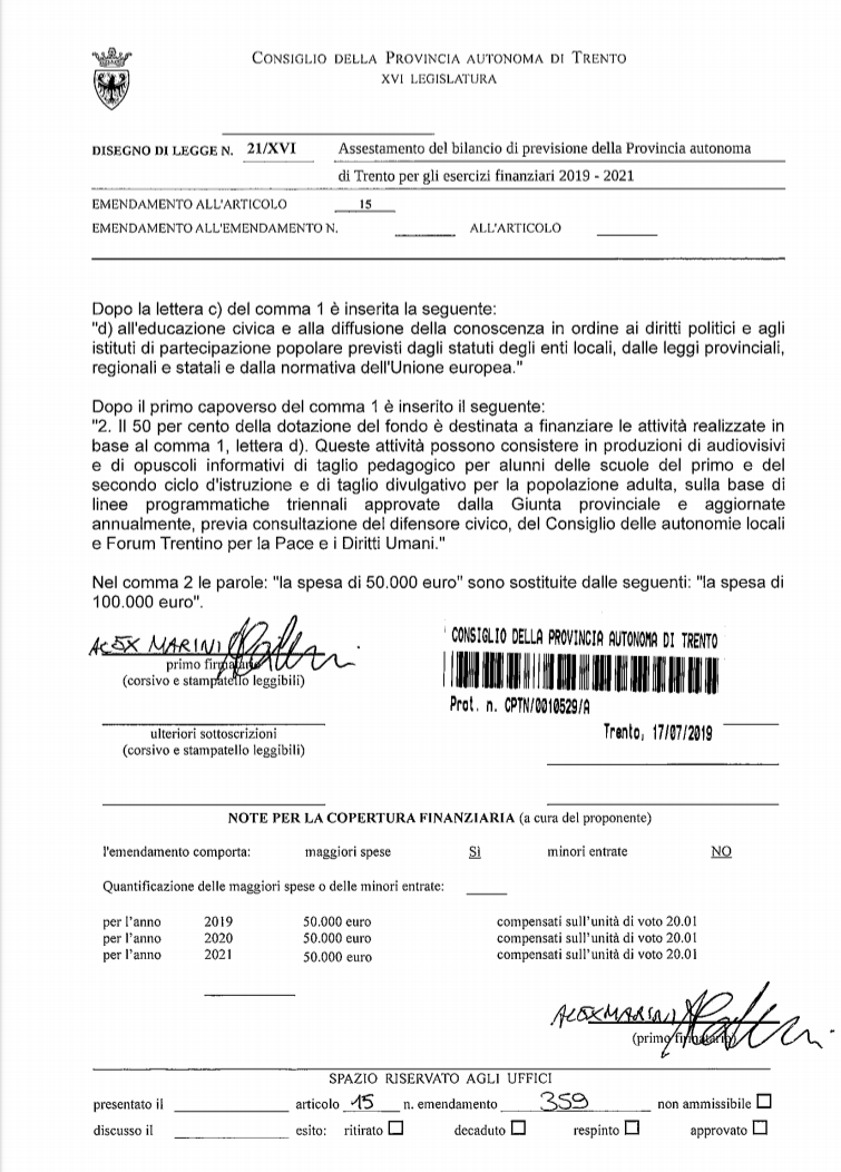 La maggioranza ha deciso di gestire l’assestamento di bilancio senza far passare nessuno (o quasi…) degli emendamenti proposti dalle minoranze. Era loro diritto, come era diritto delle minoranze rispondere a questa chiusura con l’ostruzionismo. È da queste premesse che è logicamente seguito il “conflitto in Aula” e come succede quando prevale l’irragionevolezza non c’è stato verso di far passare nemmeno le proposte di buon senso quasi tutte a costo 0. Sono stati “falciati” in questa maniera un emendamento per rendere trasparenti i premi di risultato dei dirigenti provinciali, un altro che voleva riportare a pieno organico l’ufficio stampa del Consiglio provinciale e persino un intervento per sostenere e potenziare la conoscenza dell’educazione civica a partire dagli istituti di partecipazione popolare…