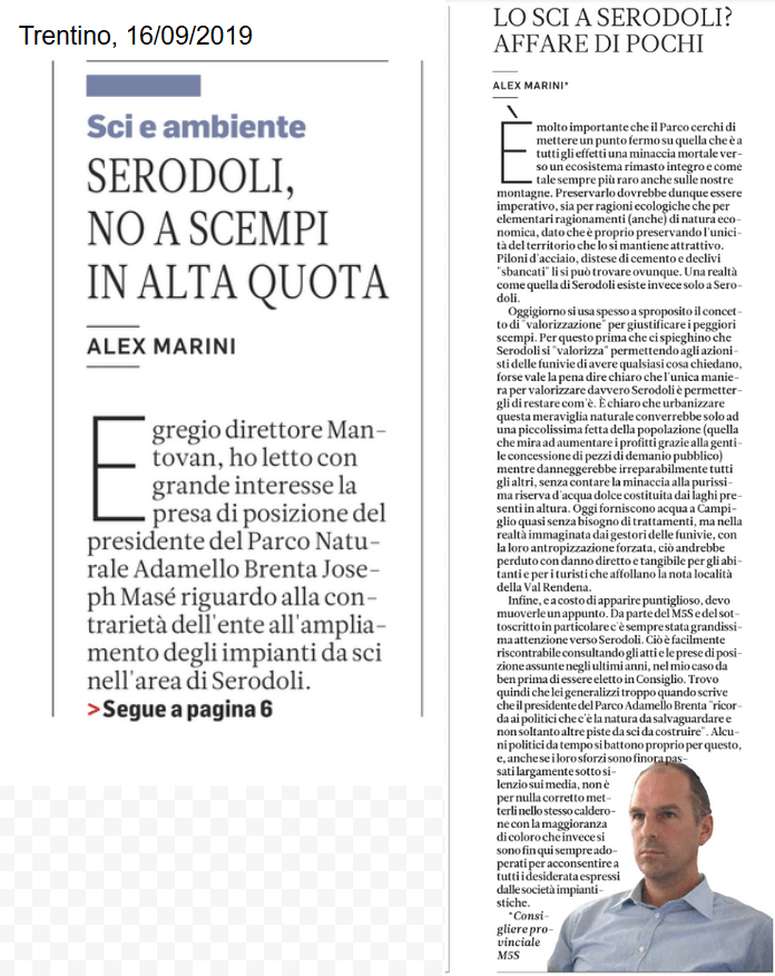 sempre nell’intervista menzionata in precedenza, l’assessore pro tempore all’Ambiente entra anche nel merito della richiesta avanzata da numerose società impiantistiche di ottenere modificazioni del PUP favorevoli alla realizzazione di nuove piste sciabili, anche in aree protette o dal particolare rilievo ambientale. In particolare si sottolinea il seguente virgolettato attribuito ancora all’assessore pro tempore all’Ambiente: «So che hanno parlato anche di Serodoli all’assemblea delle funivie, ma non credo che quello sia il loro interesse, perché sanno benissimo delle difficoltà che ci sarebbero, tanto che quando ci siamo incontrati a me non ne hanno parlato. Se parliamo del completamento dell’area di Campiglio, la valuteremo con senso di responsabilità. Anche perché quella è una realtà importante all’interno di un carosello sciistico che ha garantito uno sviluppo importante negli anni e lo sta garantendo anche ora. La loro richiesta è pertanto legittima. Sarebbe sbagliato da parte mia ancor prima di fare delle verifiche, dire “non vanno bene”. La serietà ci spinge a fare approfondimenti e trovare il giusto equilibrio» («Pronti a ragionare su ampliamenti, ma non a Serodoli» – Trentino, 15 settembre 2019, pagina 15);