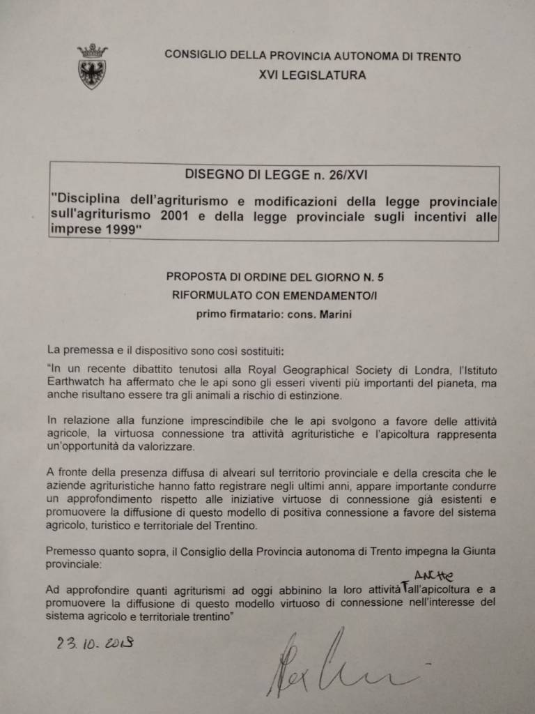 a predisporre, entro mesi 6 dall’approvazione del presente ordine del giorno, uno studio in merito a vantaggi e criticità derivanti dall’introduzione dell’apicoltura come supporto alle attività agrituristiche, avendo cura di valutare i possibili impatti in termini di riduzione dell’utilizzo di erbicidi e pesticidi e di verificare preliminarmente quale sia il numero degli agriturismi trentini che già abbinano alla propria attività all’apicoltura.