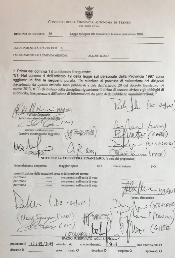 EDIT 18/12/2019: Alla fine il Consiglio provinciale ha risposto positivamente alla mia sollecitazione in merito agli obblighi di trasparenza riguardanti i dirigenti provinciali e proprio nella giornata di ieri ha approvato un mio emendamento che mette le cose in ordine. D’ora in poi anche in Trentino verranno resi pubblici i premi di risultato, i criteri per assegnarli e i punteggi che hanno determinato eventuali premi! Insomma, su questo fronte possiamo proprio dire di avere portato a casa una grande vittoria per tutti i cittadini e per le Istituzioni stesse!