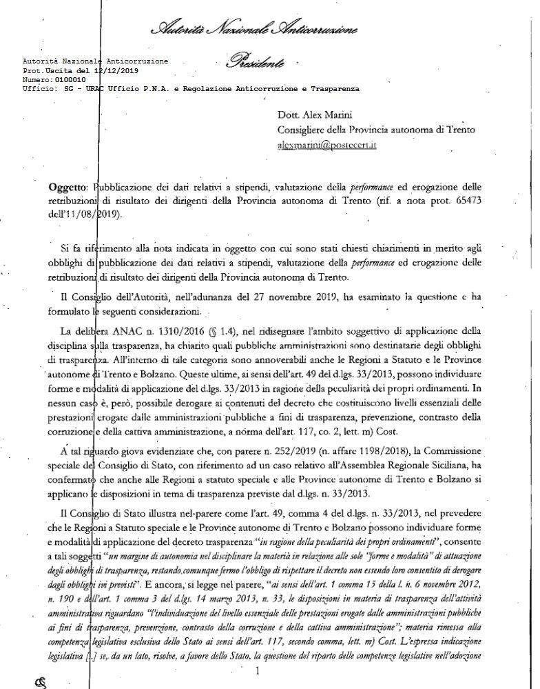 In assenza di riscontri da parte della giunta provinciale non è rimasto quindi che rivolgermi all’Anac, la quale, come potete leggere sotto, ha risposto nei giorni scorsi riconoscendo sostanzialmente la legittimità delle mie richieste.