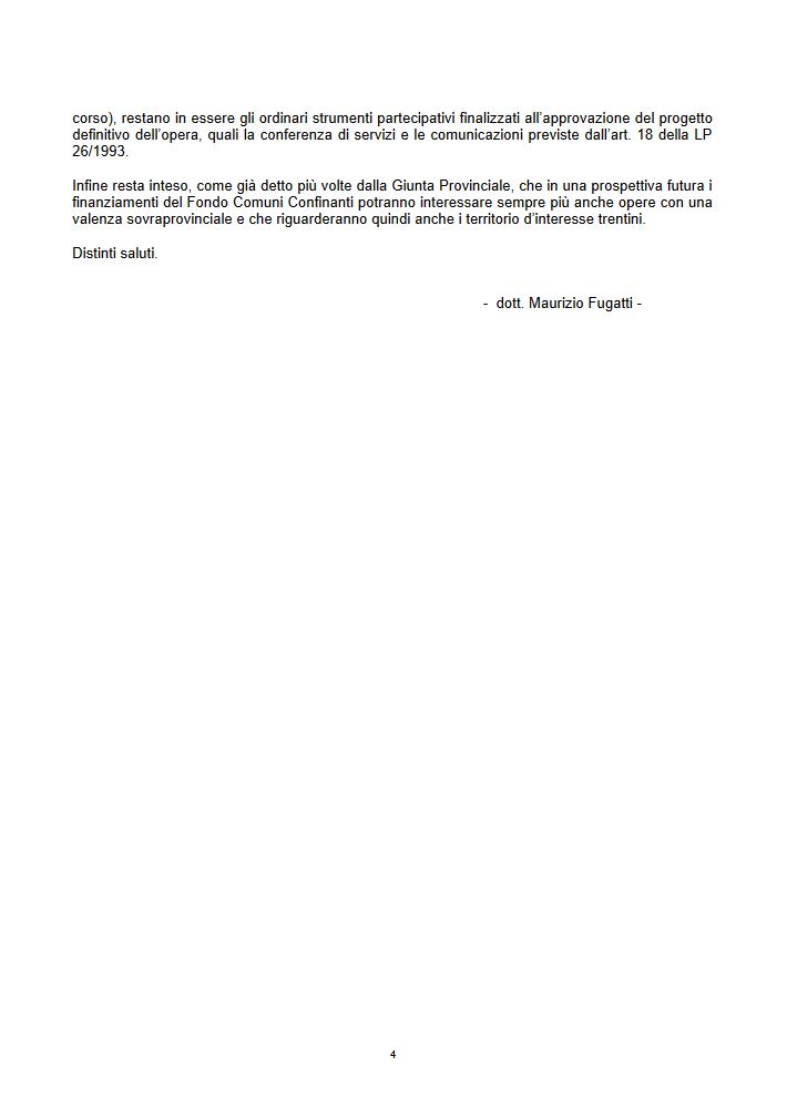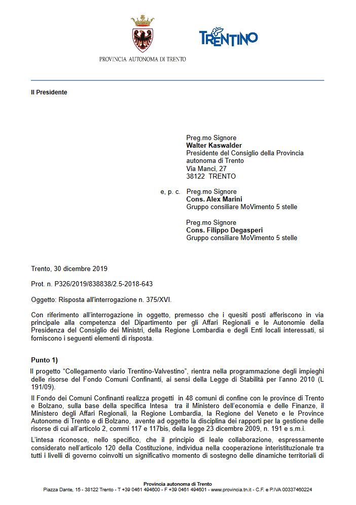 Sul tunnel della Val Vestino, il traforo lungo circa 5 chilometri da percorrere a senso unico alternato (!) che si vorrebbe realizzare per collegare il Comune trentino di Bondone a quelli lombardi (per ora almeno) di Magasa e Valvestino è arrivata in questi giorni la risposta della Provincia ad una mia interrogazione del 25 marzo scorso. Si conferma la volontà di costruire un’opera senza che le comunità locali trentine si siano espresse, senza una seria valutazione sui costi-benefici dell’opera e senza che i Comuni lombardi coinvolti siano effettivamente passati al Trentino come hanno chiesto di fare da tempo.