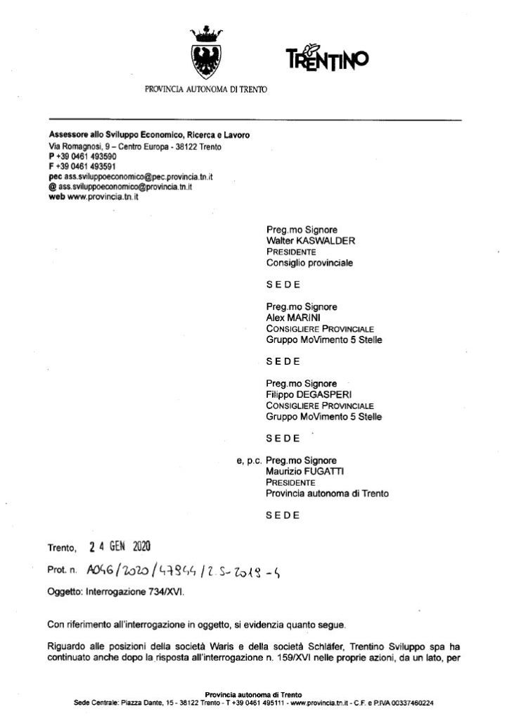 Ci sono aggiornamenti importanti riguardo alla vicenda che ormai da tempo coinvolge i lavoratori delle ditte Waris e Schläfer con sede a Storo. Come potete leggere nella risposta all’interrogazione che avevo presentato lo scorso agosto (la 734/XVI), la controllata provinciale Trentino Sviluppo (TS) ha avviato le pratiche per chiedere e ottenere il recupero dei crediti dovuti dalle 2 imprese in questione, affitti non pagati per diverse decine di migliaia di euro. Allo stesso tempo sempre TS ha intimato lo sfratto a Schläfer, atto che avrebbe dovuto concretizzarsi entro il 15 gennaio scorso. Il tutto, va detto, è comunque oggetto di ricorsi in tribunale. Riguardo al sostegno da assicurare a dipendenti ed ex dipendenti delle 2 imprese invece la Provincia ricorda che potranno ottenere gli stipendi non pagati e le quote di Tfr cui hanno diritto grazie al fondo nazionale di garanzia dell’Inps, mentre TS e PAT sostengono di poter solo attivare un’azione di “stimolo e facilitazione” nei confronti delle banche affinché anticipino ai lavoratori quanto spetta loro (ma solo a patto che i sindacati di riferimento ne facciano richiesta). A queste notizie ne aggiungo io un’ultima: per quel che riguarda Waris, nel dicembre scorso l’impresa ha avanzato richiesta di concordato preventivo.
