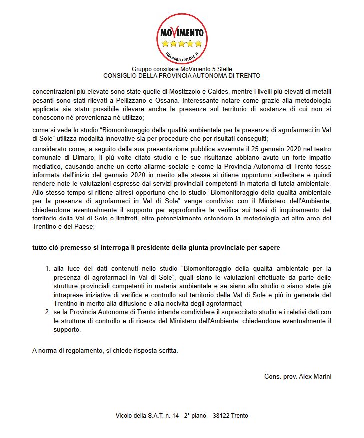 Lo studio è stato presentato al pubblico lo scorso 25 gennaio. La Provincia di Trento ne era stata informata dall’inizio di quel mese ma deve ancora esprimersi sui suoi contenuti. È importante che ciò avvenga presto, sia per garantire risposte agli abitanti delle Valli di Sole, Rabbi e Peio, giustamente preoccupati per quanto hanno potuto apprendere consultando i dati della ricerca, che per valutare l’opportunità di coinvolgere le strutture dello Stato affinché prestino sostegno e risorse ad eventuali interventi di tutela ambientale. In prospettiva inoltre si potrà valutare di estendere questa metodologia di valutazione degli inquinanti anche al resto del Trentino e, perché no, al resto del Paese. Tutte scelte che ho sollecitato con l’interrogazione provinciale che trovate in calce a questo messaggio.