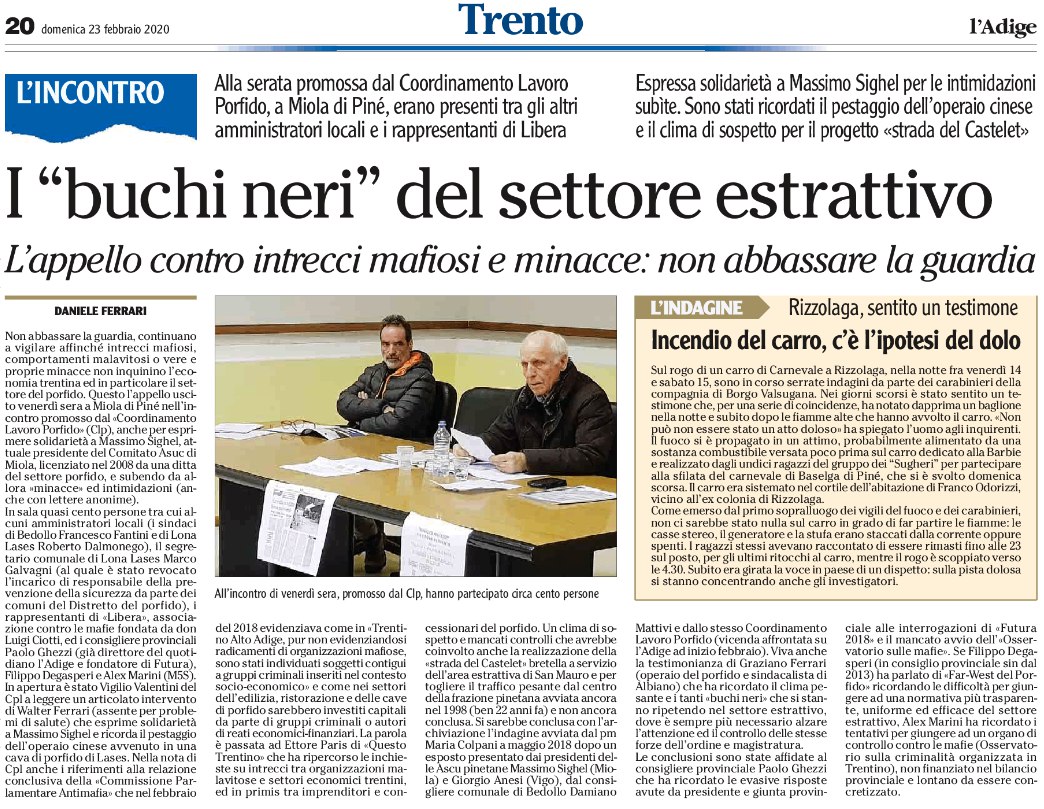 Il 21 febbraio ho detto la mia nella serata organizzata dal Comitato Lavoro Porfido a Baselga di Pinè illustrando come le scelte politiche della maggioranza provinciale e il disinteresse dei media abbiano bloccato il varo dell’Osservatorio sulla criminalità organizzata in provincia di Trento (I buchi neri del settore estrattivo – L’Adige). Incidentalmente nei giorni successivi, dopo l’interessamento del senatore M5S Nicola Morra in risposta alle nostre sollecitazioni, si è svolta anche la seconda serie di audizioni presso la Commissione bicamerale antimafia per acquisire elementi in ordine alle infiltrazioni criminali nell’economia legale in Trentino. Il 26 febbraio si è svolta infatti l’audizione del Maresciallo Maggiore dei Carabinieri Nichilo Cataldo. La prima audizione ebbe luogo il 6 novembre 2019 (resoconto stenografico) quando furono chiamati a relazionare il dottor Marco Galvagni e Vigilio Valentini del Coordinamento Lavoratori Porfido.