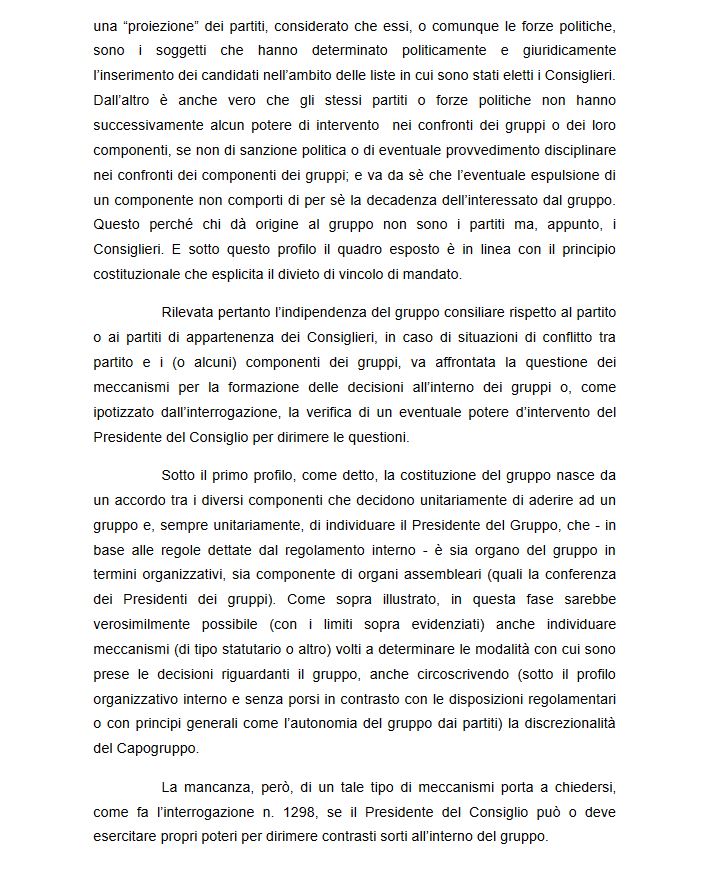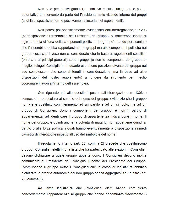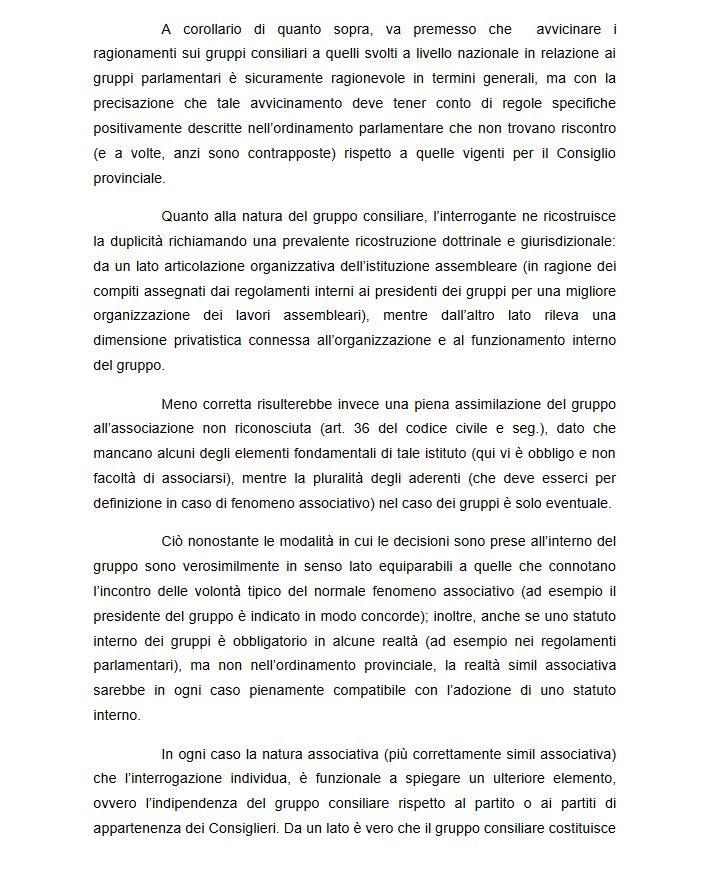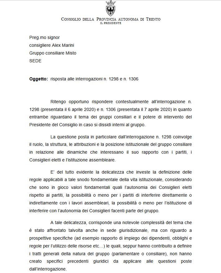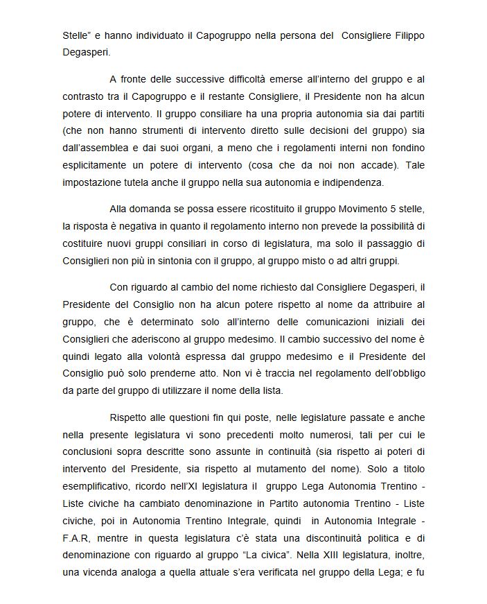 È arrivata da qualche giorno la risposta del presidente Kaswalder riguardo a 2 interrogazioni da me presentate per chiedere di venir riconosciuto il diritto degli elettori del M5S a vedere rappresentato il loro voto da un gruppo consiliare specifico presente e riconoscibile tramite simbolo in Consiglio provinciale. Il testo, che potete “apprezzare” qui sotto, è in giuridichese puro ma il succo è molto semplice: siccome i gruppi consiliari in Trentino non hanno una disciplina specifica chi c’è dentro può fare quello che vuole a prescindere dalla forza politica che ne ha permesso l’elezione.