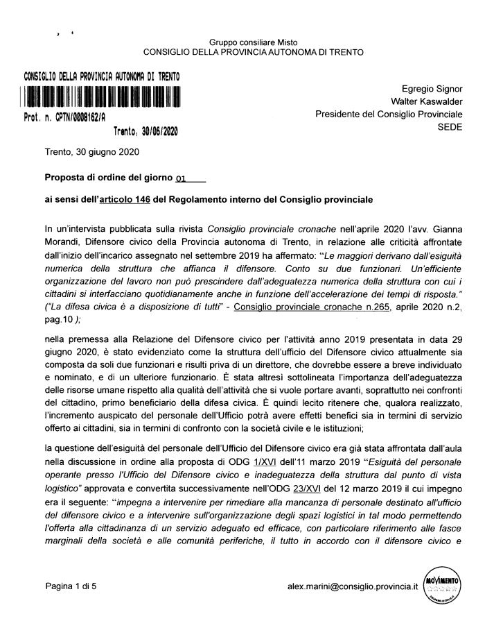 la questione dell’esiguità del personale dell’Ufficio del Difensore civico era già stata affrontata dall’aula nella discussione in ordine alla proposta di ODG 1/XVI dell’11 marzo 2019 Esiguità del personale operante presso l’Ufficio del Difensore civico e inadeguatezza della struttura dal punto di vista logistico” approvata e convertita successivamente nell’ODG 23/XVI del 12 marzo 2019 il cui impegno era il seguente: “impegna a intervenire per rimediare alla mancanza di personale destinato all’ufficio del difensore civico e a intervenire sull’organizzazione degli spazi logistici in tal modo permettendo l’offerta alla cittadinanza di un servizio adeguato ed efficace, con particolare riferimento alle fasce marginali della società e alle comunità periferiche, il tutto in accordo con il difensore civico e compatibilmente con il progetto di bilancio del Consiglio”;