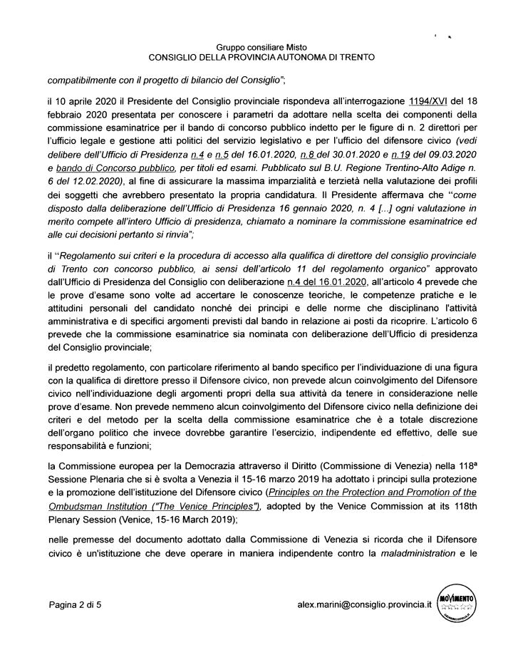il 10 aprile 2020 il Presidente del Consiglio provinciale rispondeva all’interrogazione 1194/XVI del 18 febbraio 2020 presentata per conoscere i parametri da adottare nella scelta dei componenti della commissione esaminatrice per il bando di concorso pubblico indetto per le figure di n. 2 direttori per l’ufficio legale e gestione atti politici del servizio legislativo e per l’ufficio del difensore civico (vedi delibere dell’Ufficio di Presidenza n.4 e n.5 del 16.01.2020, n.8 del 30.01.2020 e n.19 del 09.03.2020 e bando di Concorso pubblico, per titoli ed esami. Pubblicato sul B.U. Regione Trentino-Alto Adige n. 6 del 12.02.2020), al fine di assicurare la massima imparzialità e terzietà nella valutazione dei profili dei soggetti che avrebbero presentato la propria candidatura. Il Presidente affermava che “come disposto dalla deliberazione dell’Ufficio di Presidenza 16 gennaio 2020, n. 4 […] ogni valutazione in merito compete all’intero Ufficio di presidenza, chiamato a nominare la commissione esaminatrice ed alle cui decisioni pertanto si rinvia”;