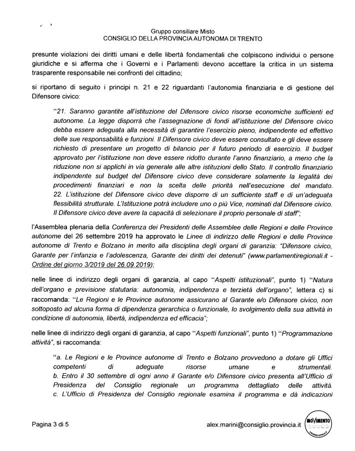 l’adeguamento, che potrebbe essere facilitato anche dal sostanzioso avanzo di bilancio del Consiglio provinciale, permetterebbe alla Provincia di Trento una più piena affermazione di un sistema di garanzie basato sulla democrazia, sullo stato di diritto, sul rispetto dei diritti umani e delle libertà fondamentali e sulla buona amministrazione che trova fondamento in diversi documenti adottati dall’Assemblea Generale delle Nazioni Unite adottati in seguito all’approvazione della Risoluzione 48/134 sui principi relativi allo Status delle Istituzioni Nazionali per la promozione e la protezione dei diritti umani (i “Principi di Parigi”) del 20 dicembre 1993;