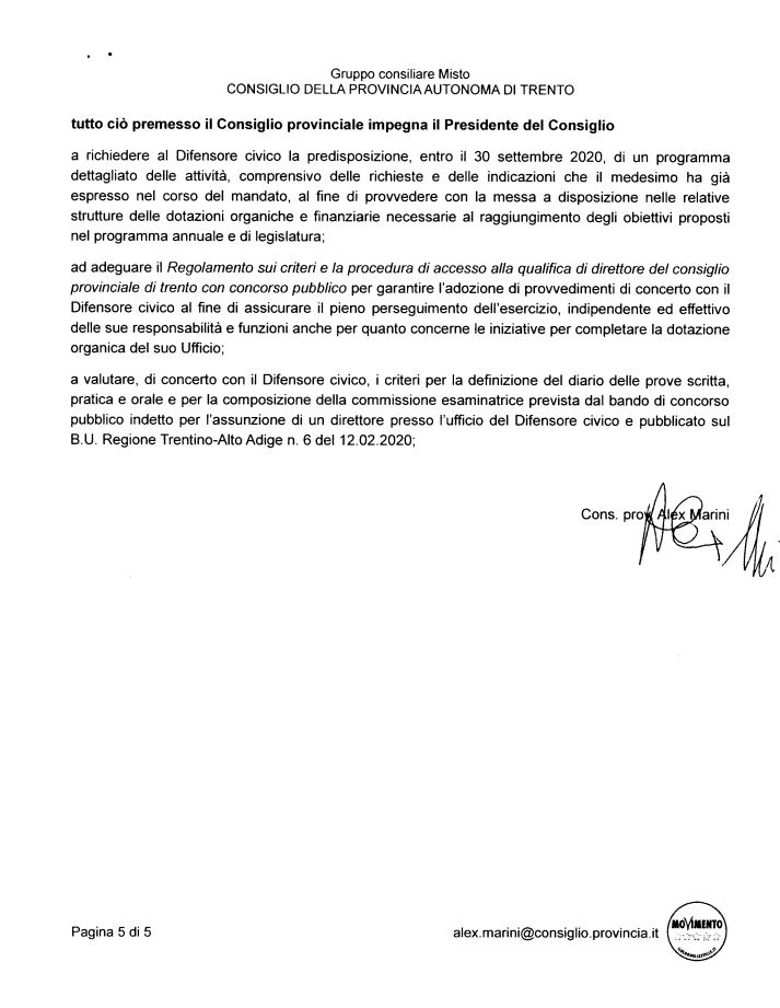 Con il primo ordine del giorno ho proposto che il Presidente del Consiglio richieda al Difensore Civico la predisposizione, entro il 30 settembre 2020, di un programma dettagliato delle attività, comprensivo delle richieste e delle indicazioni che il medesimo ha già espresso nel corso del mandato, al fine di provvedere con la messa a disposizione nelle relative strutture delle dotazioni organiche e finanziarie necessarie al raggiungimento degli obiettivi proposti nel programma annuale e di legislatura. Ho proposto inoltre che l’ufficio del Difensore civico sia coinvolto nelle procedure di selezione del personale ai sensi dei Principi di Venezia del Commissione europea per la Democrazia attraverso il Diritto e delle Linee di indirizzo delle Regioni e delle Province autonome di Trento e di Bolzano in merito alla disciplina degli organi di garanzia.