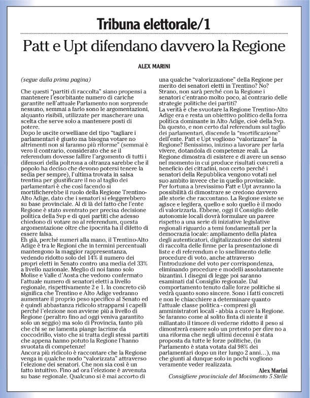 Dopo le uscite orwelliane del tipo “tagliare i parlamentari è giusto ma bisogna votare no altrimenti non si faranno più riforme” (semmai è vero il contrario, considerato che se il referendum dovesse fallire l’argomento di tutti i difensori della poltrona a oltranza sarebbe che il popolo ha deciso che devono potersi tenere la sedia per sempre… come si vede quando c’è l’interesse la logica va a farsi benedire molto in fretta…), l’ultima trovata in salsa trentina per giustificare il no al taglio dei parlamentari è che così facendo si mortificherebbe il ruolo della Regione Trentino-Alto Adige, dato che i senatori si eleggerebbero su base provinciale. Al di là del fatto, noto a tutti, che l’ente Regione è stato letteralmente sventrato per precisa decisione politica della Svp e di quei partiti che adesso chiedono di votare no al referendum, questa argomentazione oltre che ipocrita ha il difetto di essere pure palesemente falsa.
