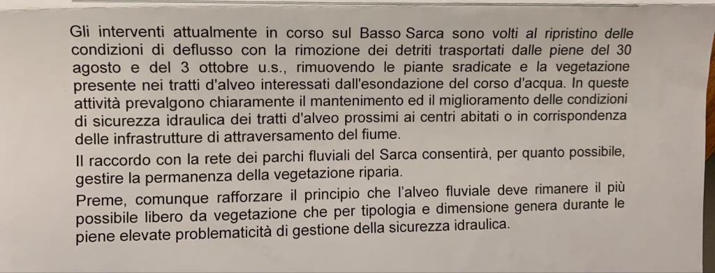 Risulta che, a seguito della piena della Sarca seguita alle forti precipitazioni in inizio ottobre 2020, il Servizio Bacini Montani della Provincia Autonoma di Trento abbia messo in cantiere numerosi interventi lungo il medesimo corso d’acqua nell’intento di garantirne la sicurezza. Tali interventi starebbero comportando non solo la rimozione della vegetazione sradicata dalla recente piena, ma almeno in alcune zone, starebbero interessando anche la vegetazione riparia. Risulta inoltre che in capo al Servizio Bacini Montani vi sia la stesura del “Piano di gestione della vegetazione fluviale del fiume Sarca”, detto documento, stilato tenendo conto dei contributi emersi dagli incontri delle reti delle riserve della Sarca, tuttavia non risulterebbe essere ancora stato trasmesso al Parco Fluviale Sarca.