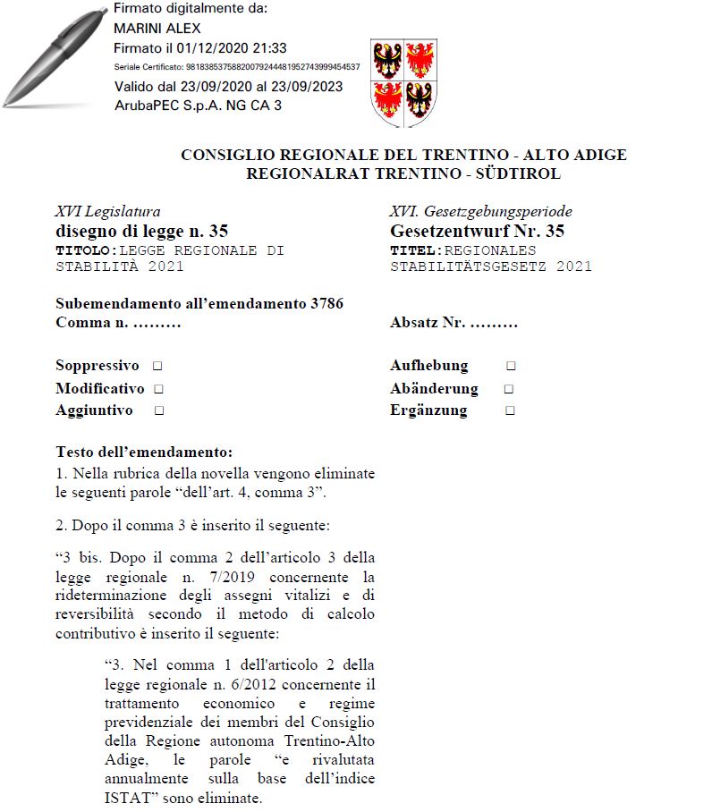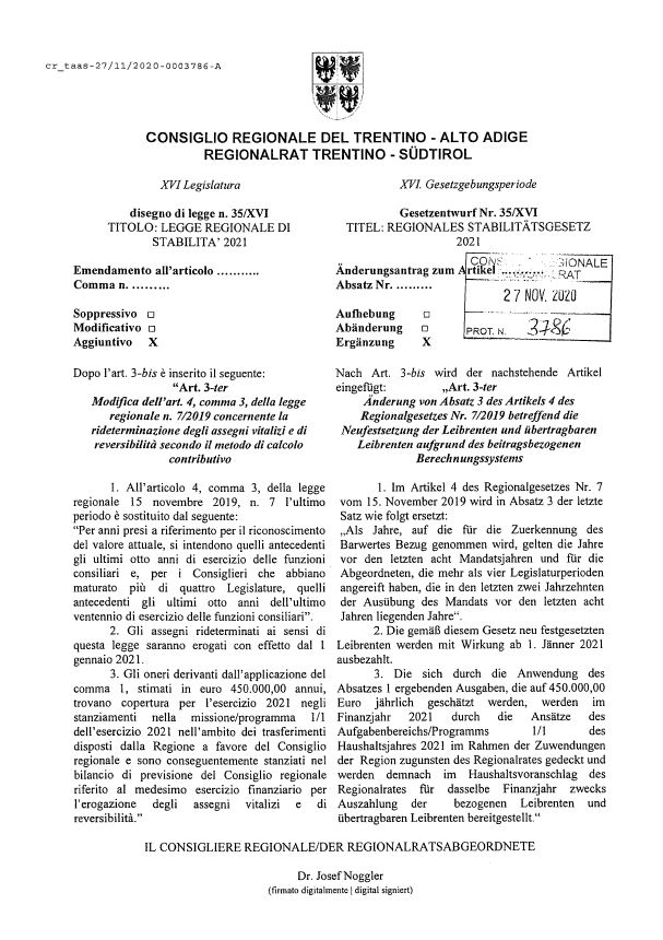 Di seguito l’emendamento Noggler per aumentare i vitalizi e la rassegna stampa: