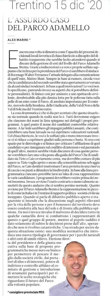 Quanto avviene per il Parco Naturale Adamello Brenta è la rappresentazione in piccolo di come in Italia e in Trentino il rapporto politica-società civile sia inceppato e manomesso. Quando si parla di dibattito pubblico aperto e trasparente si intende che la discussione sugli aspetti rilevanti per la vita delle persone e per il benessere del territorio deve essere condotta alla luce del sole e di fronte alla pubblica opinione. Da noi è invece invalso il malvezzo di decidere tutto in qualche camarilla dove si combattono i rappresentanti di questo o quel gruppo di potere, mentre al popolo suddito è dato solamente di subire le decisioni prese dall’alto, sperando che non si rivelino catastrofiche.Una strada per uscire da questa situazione esiste: una modifica normativa che introduca una nuova tipologia di governance per i parchi naturali ed altri enti di simile rilievo. Elezione diretta del presidente e della giunta esecutiva sulla base di proposte programmatiche messe nero su bianco per permettere di pescare il meglio dalla società civile, dai portatori di idee e di interessi, potere di indirizzo e controllo affidato al comitato di gestione e introduzione di strumenti partecipativi per rimettere le scelte strategiche che riguardano il futuro del Parco alla volontà popolare.