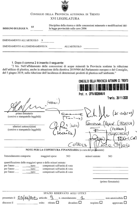 Un emendamento a mia prima firma permetterà al Trentino di avere una normativa d’avanguardia a livello nazionale riguardo al contrasto dell’inquinamento da plastica. In caso di bando di gara per l’assegnazione di una concessione sulle acque minerali otterranno più punti le imprese che si impegnano a convertire l’imbottigliamento dell’acqua dalla plastica al vetro e in ogni caso anticipando gli obiettivi posti dall’Unione Europea proprio riguardo il contenimento dell’inquinamento da plastiche.
