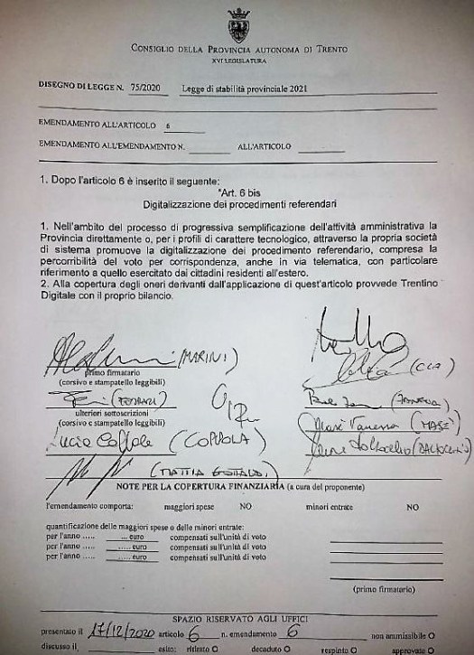 Se la disposizione normativa venisse attuata (art.8 della LP n.16/2020) si potrebbe perseguire una doppia finalità: facilitare l’esercizio del diritto di voto alle consultazioni referendarie provinciali e risparmiare risorse pubbliche per centinaia di migliaia di euro ad ogni votazione. Non faremo quindi mai mancare il nostro contributo affinché un domani i trentini possano partecipare direttamente agli affari pubblici della collettività locale.