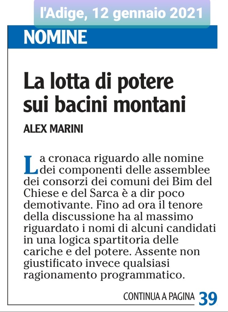 La cronaca riguardo alle nomine dei componenti delle assemblee dei consorzi dei comuni dei Bim del Chiese e del Sarca è a dir poco demotivante. Fino ad ora il tenore della discussione ha al massimo riguardato i nomi di alcuni candidati in una logica spartitoria delle cariche e del potere. Assente non giustificato invece qualsiasi ragionamento programmatico.