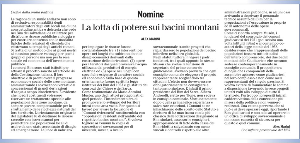 Come ci ricorda sempre Muson, i fondatori del consorzio dei comuni giudicariesi del 1951 (poi sciolto una volta istituiti i Bim) e al contempo co-autori della legge statale del 1953, desideravano che i rappresentanti delle popolazioni fossero tutti cittadini dell’intero comprensorio, dei due bacini montani delle Giudicarie e che nessuno sedesse contemporaneamente in consiglio comunale. Il proposito era dunque che i componenti delle assemblee agissero come giudicariesi nel loro complesso e non come meri rappresentanti del singolo paesino. Si voleva evitare di frammentare le somme a disposizione favorendo invece progetti unitari volti allo sviluppo di tutto il territorio. Purtroppo i propositi iniziali caddero vittima della concezione più misera della politica e non vennero realizzati. Una catena perversa che si può e si deve spezzare oggi, riportando i Bim giudicariesi e non solo ad operare in un’ottica di sviluppo sovracomunale e non come cassetta di sicurezza per questo o quel comune. *