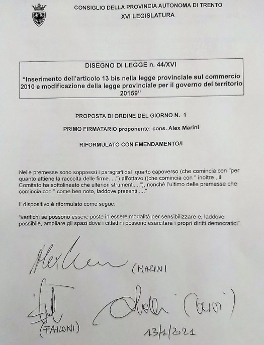 A partire dal preoccupante calo degli indici di partecipazione civica rilevati da ISTAT e ISPAT e dalla crescente difficoltà che i comitati civici hanno nell’accedere agli istituti di democrazia diretta previsti dalla Costituzione e dall’ordinamento giuridico generale, abbiamo dunque elaborato delle proposte per colmare un vuoto che impedisce il pieno godimento delle libertà democratiche permettendo ai comitati civici di poter raccogliere firme di fronte alle aree commerciali. L’idea è stata accolta con parere positivo da parte della Giunta provinciale che ha chiesto del tempo per poter valutare un intervento normativo ad hoc, suggerendo pertanto di ritirare l’emendamento, ma, con una modifica tecnica, ha dato indicazioni ai consiglieri di maggioranza di approvare la proposta di ordine del giorno.