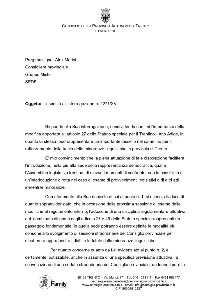 Segue il testo dell’Interrogazione 2271/XVI del 9 febbraio 2021 “Sessioni straordinarie del Consiglio provinciale presso i territori delle minoranze linguistiche e modifiche al regolamento interno” e della risposta fornita il 10 marzo 2021
