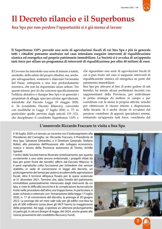 Nell’ultimo numero della rivista di ITEA sono stati annunciati gli interventi programmati dall’istituto di edilizia popolare della Provincia autonoma di Trento. Parliamo di potenziali interventi su 300 stabili per un totale di 1.200 alloggi. La misura ideata e proposta dal portavoce M5S in Trentino-Alto Adige Riccardo Fraccaro consente di avere benefici fiscali nell’ordine di 30 milioni ma soprattutto di migliorare l’efficienza energetica e dunque risparmi energetici, riduzione di emissioni di CO2 e dei costi in bolletta a vantaggio degli inquilini e dell’intera collettività per i prossimi decenni.