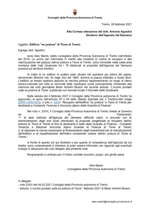 A inizio mese, su proposta del M5S il Consiglio provinciale di Trento ha approvato la proposta di voto n. 2/XVI “Recupero dell’edificio “ex pretura” a Tione di Trento per destinarla a Comando Tenenza e Soccorso alpino della Guardia di Finanza”. Conoscendo le difficoltà di transito dei voti provenienti dalle autonomie locali e diretti a Governo e Parlamento e consapevole dell’assenza di una procedura trasparente per la loro trattazione, ho pensato di scrivere direttamente all’Agenzia del Demanio per segnalare il voto dell’Aula e per avere notizie di prima mano sulle iniziative messe in campo per il recupero dello storico edificio.