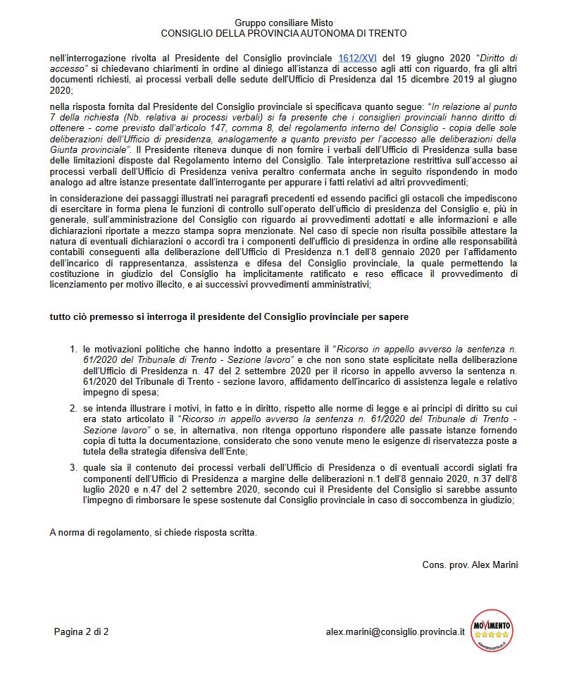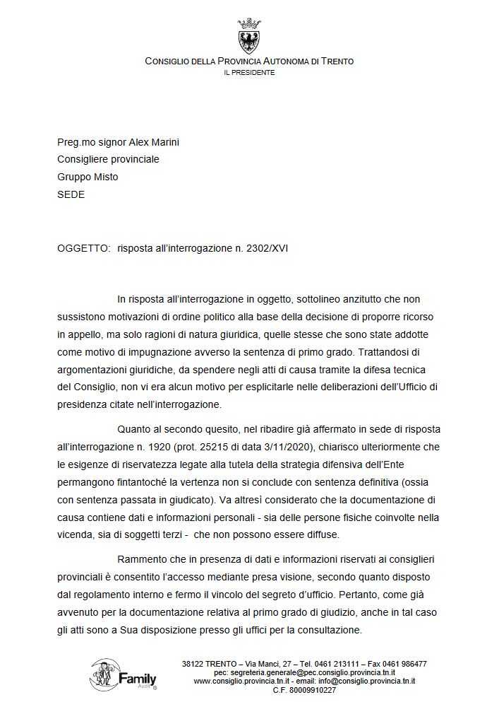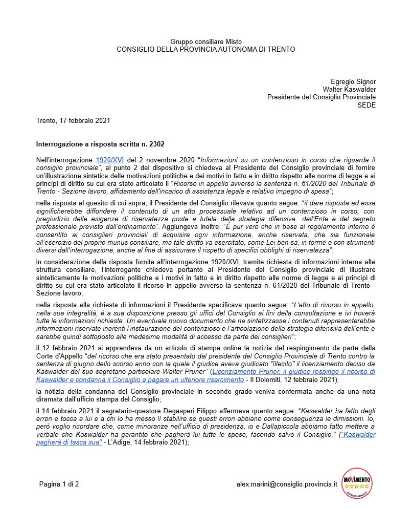 Interrogazione n. 2302/XVI del 17 febbraio 2021 a risposta scritta “Informazioni su un contenzioso in corso che riguarda il consiglio provinciale” e relativa risposta: