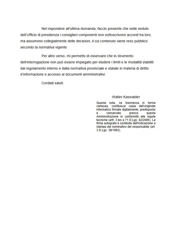 La risposta fornita dal presidente Kaswalder