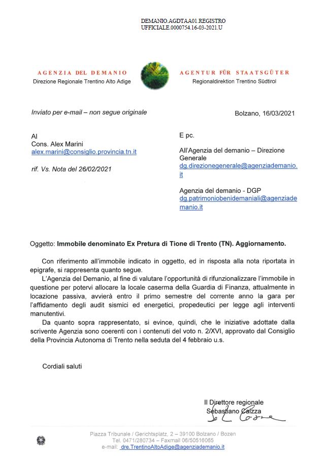Ecco la risposta del direttore dell’Agenzia Regionale del Demanio alla mia lettera di sollecito rispetto al recupero del palazzo dell’ex Pretura di Tione: