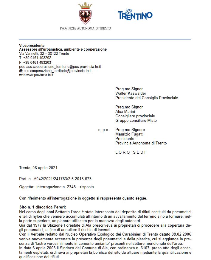 Segue interrogazione 2348/XVI del 1° marzo 2021 “Controlli ed interventi di messa in sicurezza effettuati su alcune discariche nell’area Pilcante del Comune di Ala”