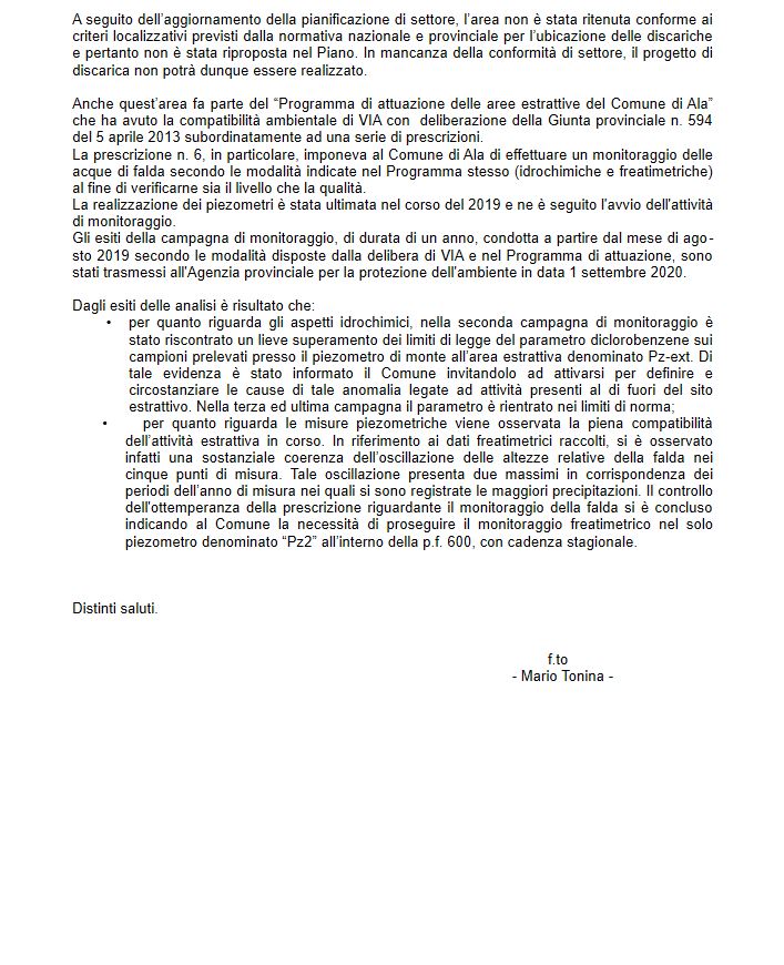 il Piano Cave del comune di Ala, risalente all’anno 2013 prevede il posizionamento di due pozzi piezometrici per il controllo della falda. Il piano in questione prevede inoltre che le analisi effettuate siano messe a disposizione degli interessati e più in generale della cittadinanza, tuttavia parrebbe che quest’obbligo, che avrebbe dovuto essere adempiuto già nel 2014, non sia mai stato pienamente rispettato e che di conseguenza non sarebbero mai state effettuate le relative analisi;