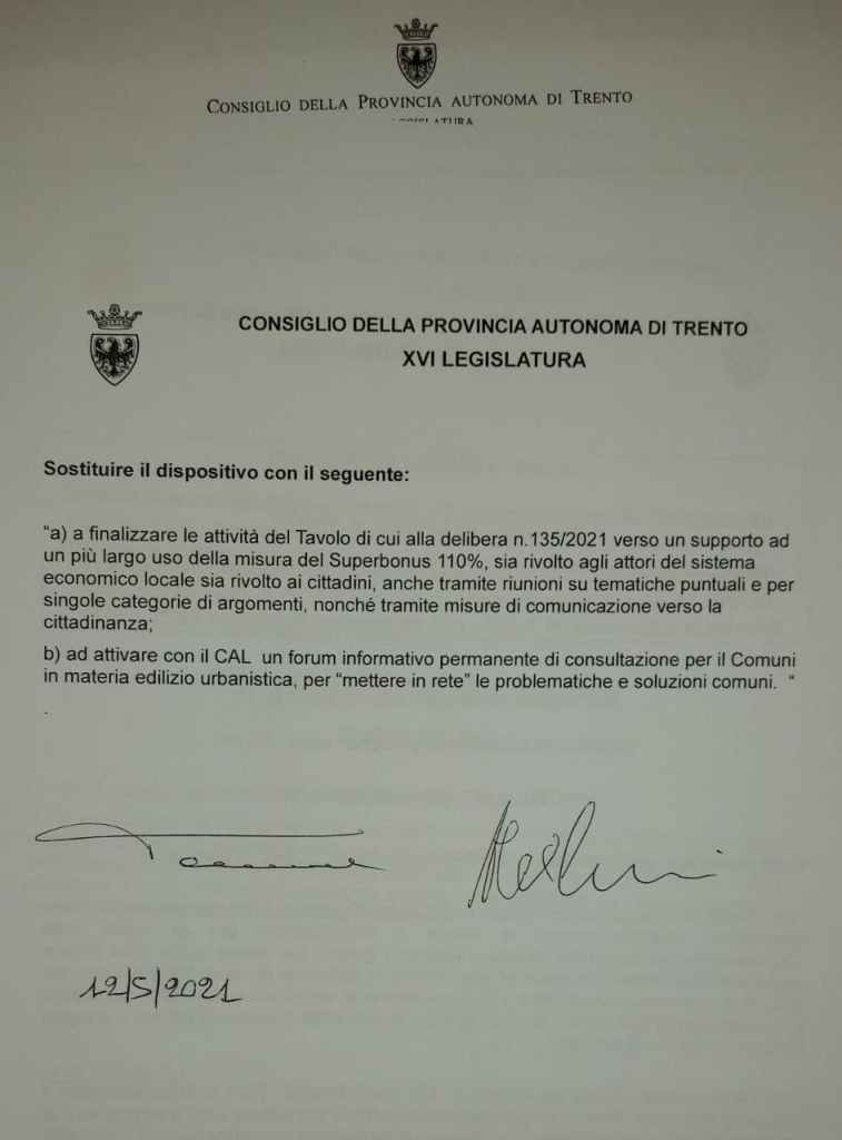 in un’intervista rilasciata nel mese di aprile, l’Assessore all’urbanistica, ambiente e cooperazione, affermava con soddisfazione che, con la legge provinciale 30 marzo 2021, n. 5 “Misure urgenti di semplificazione in materia di edilizia, urbanistica ed enti locali”, si sono rese più facili e più veloci le procedure per accedere al Superbonus 110 per cento (“Edilizia: meno burocrazia e pratiche più veloci per l’Ecobonus” – Comunicato stampa della Provincia n. 820 del 07 aprile 2021);