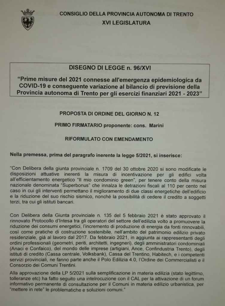 Segue il testo integrale della proposta di ordine del giorno n.12/96/XVI del xx maggio 2021 collegata al disegno di legge n. 96/XVI “Prime misure del 2021 connesse all’emergenza epidemiologica da COVID-19 e conseguente variazione al bilancio di previsione della Provincia autonoma di Trento per gli esercizi finanziari 2021 – 2023”. Approvata il 12 maggio 2021 con emendamento allegato sotto