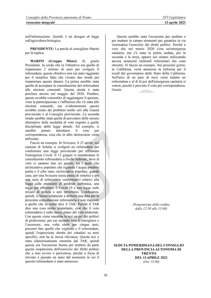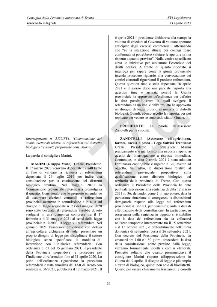 Interrogazione a risposta immediata 2522/XVI dell’8 aprile 2021 “Convocazione dei comizi elettorali relativi al referendum sul distretto biologico trentino” (risposta fornita in aula il 13 aprile)