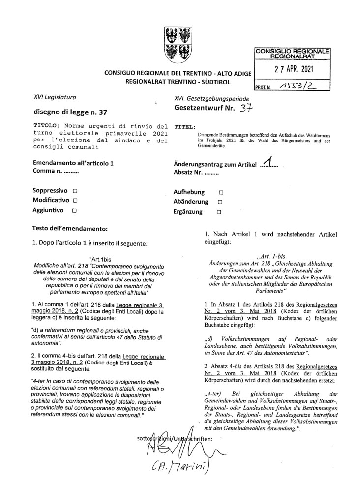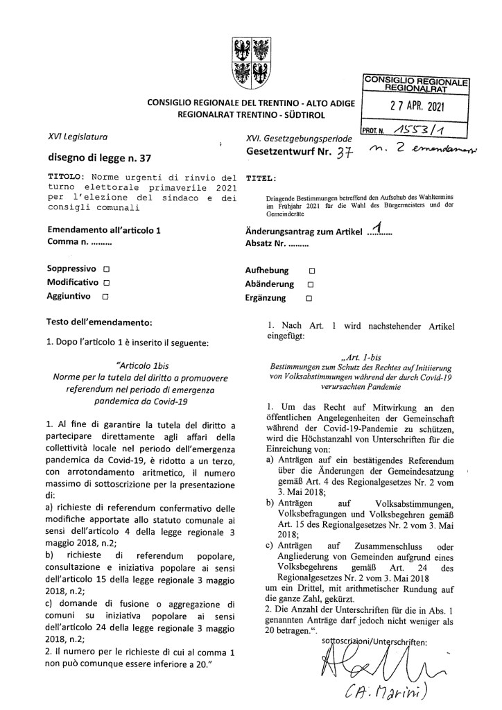 Nella seduta del 17 maggio scorso il Consiglio regionale ha trattato il disegno di legge 37/XVI (qui la relazione della Prima Commissione) per rinviare all’autunno prossimo le elezioni comunali che si sarebbero dovute tenere nella primavera del 2021. Le elezioni riguardano i comuni trentini di Brentonico, Terragnolo e Bondone e i comuni della provincia di Bolzano Merano, Glorenza e Nalles.