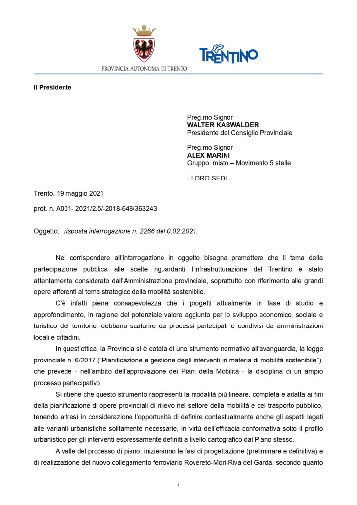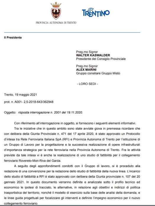 - interrogazione a risposta scritta 2001/XVI del 19 novembre 2020 “Sullo studio finalizzato a verificare la fattibilità tecnica ed economica del nuovo collegamenti ferroviario per la tratta Rovereto – Riva del Garda di cui all’art. 34, co.3, della legge provinciale di stabilità 2020 e in considerazione degli impegni dell’ordine del giorno 94/XVI”. Risposta del Risposta del 19 maggio 2021