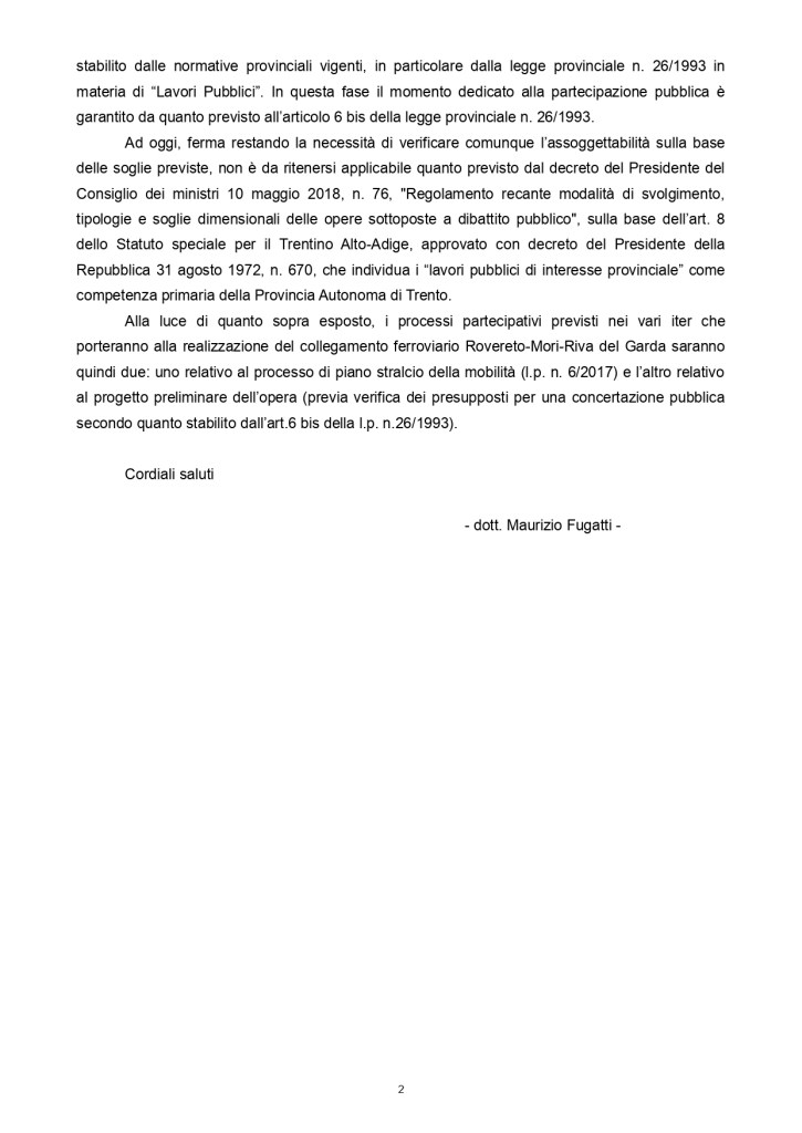Sullo stesso tema è inoltre arrivata un’ulteriore risposta a un’interrogazione presentata a febbraio sempre riguardante il collegamento ferroviario Rovereto-Riva del Garda. Sollecitavamo la Provincia ad avviare un dibattito pubblico riguardo all’opera, partendo dal concorso di idee che svolto a suo tempo nell’ambito del progetto Metroland. Il presidente della Provincia ci ha risposto che l’amministrazione è consapevole della necessità di confrontarsi con i territori sui quali verranno realizzate le opere e che, nel caso specifico della tratta Rovereto-Riva, non ci sarà un dibattito pubblico bensì due.