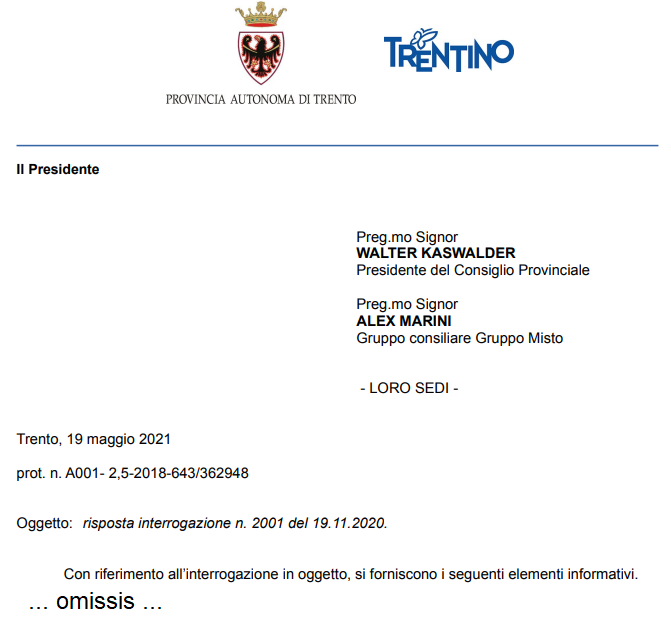 Segue l’immagine della risposta fornita il 19 maggio 2021 all’interrogazione 2001/XVI del 19 novembre “Effetti del progetto Urban Pass promosso dalla società Autostrada del Brennero Spa in base all’accordo con la Provincia autonoma di Trento”