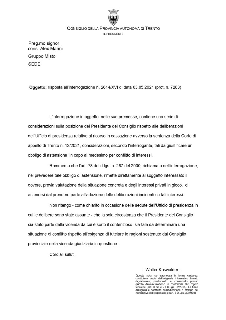 Con l’interrogazione 2042/XVI “Valutazione di possibili situazioni di conflitto di interesse in capo al Presidente del Consiglio nell’adozione di alcune deliberazioni dell’Ufficio di presidenza” si interrogava il Presidente del Consiglio provinciale per sapere se in coincidenza alla discussione e alla votazione con riguardo alle delibere n. 1 del 08.01.2020 “affidamento dell’incarico di rappresentanza, assistenza e difesa del Consiglio provinciale in relazione ad un contenzioso promosso davanti al Tribunale di Trento – sezione lavoro”, n. 37 del 08.07.2020 “Riconoscimento debito fuori bilancio ai sensi dell’articolo 73, comma 1, lettera a), del decreto legislativo 23 giugno 2011, n. 118 e successive modificazioni, a seguito della sentenza n. 61/2020 del Tribunale ordinario di Trento – sezione lavoro” e n. 47 del 02.09.2020 “ricorso in appello avverso la sentenza n. 61/2020 del Tribunale di Trento – sezione lavoro, affidamento dell’incarico di assistenza legale e relativo impegno di spesa” adottate dall’Ufficio di Presidenza del Consiglio provinciale, vi fosse stata una valutazione da parte dei componenti, e in caso quale ne fosse stato l’esito, in merito alla presunta situazione di conflitto di interessi da parte del presidente Kaswalder, con particolare riferimento alla fattispecie disciplinata dall’articolo 6bis della legge 7 agosto 1990, n. 241 “Nuove norme in materia di procedimento amministrativo e di diritto di accesso ai documenti amministrativi”;
