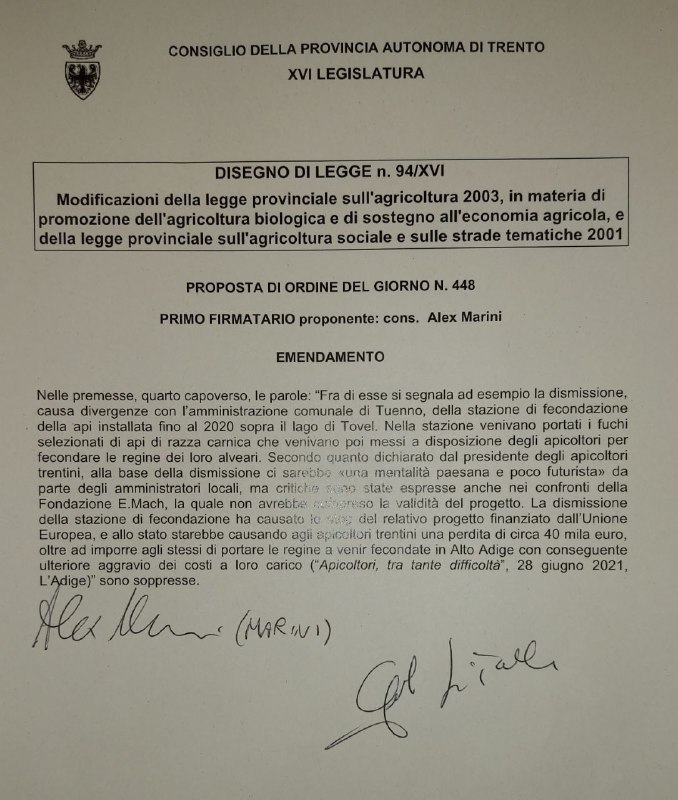 Abbiamo fatto approvare dal Consiglio provinciale (con un emendamento) un ordine del giorno che impegna la Provincia a sostenere gli apicoltori trentini. In primo luogo la PAT dovrà adoperarsi a trovare un luogo adatto ad ospitare una stazione di fecondazione delle api, perché quella attuale (nei pressi del lago di Tovel) dovrà essere smantellata per incomprensioni con Comune di Tuenno. Poi dovranno essere approntati sostegni e incentivi per gli apicoltori in modo che possano aumentare la produzione di miele biologico. Infine abbiamo ottenuto che la Provincia sensibilizzi la Fondazione E.Mach affinché si impegni di più per dare una mano agli apicoltori trentini aiutandoli a realizzare una stazione di fecondazione delle api regine sul nostro territorio provinciale.