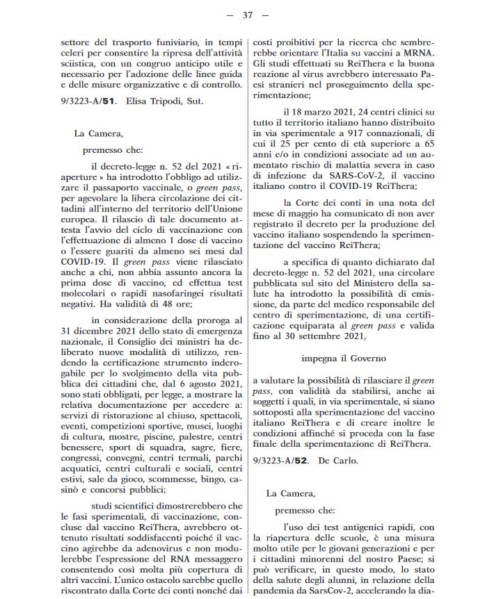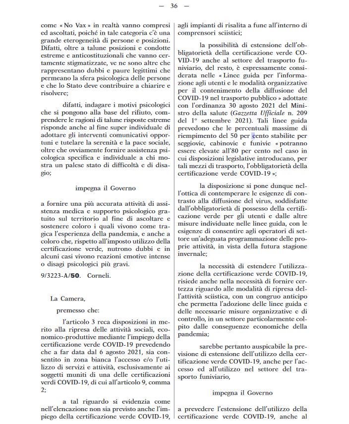 L’altro ieri alla Camera dei deputati il M5S ha presentato e ottenuto l’approvazione di un ordine del giorno a firma dei deputati Elisa Tripodi (segretaria della Commissione affari costituzionali della Camera), e Luca Sut (capogruppo M5S in commissione Attività produttive) che impegna il Governo a mettersi in moto da subito al fine di estendere i provvedimenti relativi al green pass anche alle funivie e agli impianti di risalita.
