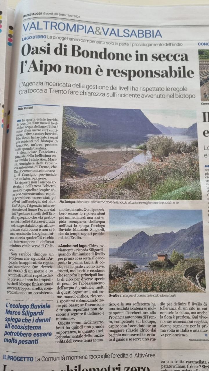 Le immagini parlano da sole. Il biotopo del lago d’Idro, preziosissima oasi naturale sulle sponde trentine dell’Eridio, è ridotto a deserto. Motivo? I massicci prelievi d’acqua che si sono intensificati nel mese di agosto e inizio settembre allo scopo di “abbeverare” le colture idrovore della bassa bresciana e mantovana, resi possibili dalla vera e propria svendita dell’acqua trentina messa in atto dalla nostra solerte giunta provinciale. Ne ha parlato anche il BresciaOggi nella rubrica Leonessa e in un articolo ad hoc, a dimostrazione dell’importanza del tema e della sua valenza interregionale. Spesso si dice che, tra inquinamento e cambiamento climatico, l’acqua sarà sempre più preziosa. Invece di darsi una regolata e di gestire con oculatezza questo bene fondamentale la destra trentina (ma anche quella nazionale) invece continua ad abusarne allegramente, causando danni enormi agli ecosistemi (vedi intervista a Maurizio Siligardi) e, piano piano, alla vita di tutti noi. O li fermiamo o presto la situazione diventerà irreparabile.