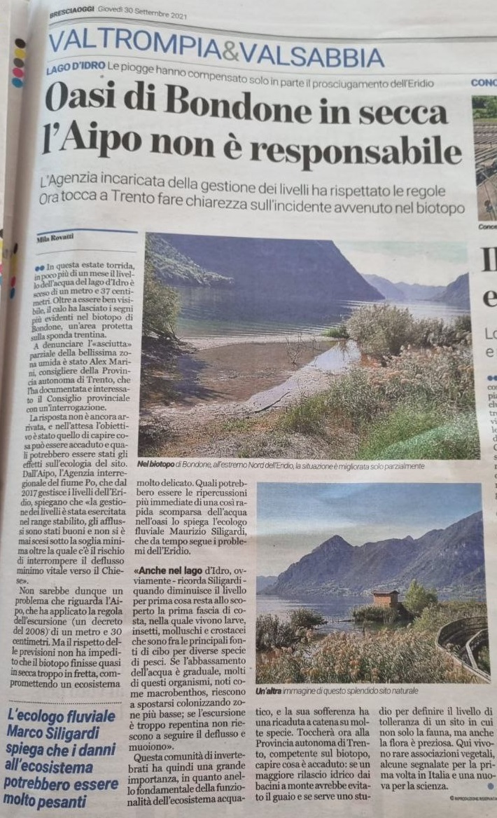 Se il quadro generale che ci si poteva attendere (e che sarebbe stato difficile negare, date le immagini che avevamo presentato…) è stato confermato, purtroppo mancano i dettagli. L’assessore all’ambiente Tonina, ha mancato infatti di specificare la natura e l’entità dei danni al biotopo e all’intero ecosistema lacustre causati dagli sbalzi del livello del lago e ci sarebbe da chiedersi come mai, visto che si tratta di informazioni rilevanti, tanto più se ci si spinge a sostenere la non irreversibilità del danno (sulla base di quali dati e di quali evidenze?). Per quanto riguarda l’incasso monetario ottenuto dallo sfruttamento intensivo dell’acqua per soddisfare le esigenze degli ottocenteschi impianti di irrigazione messi in campo dall’agricoltura lombarda, l’assessore ci ha invece informati che ci sono stati dei primi trasferimenti di denaro. In attesa di effettuare il calcolo a consuntivo è arrivata la prima tranche. Si tratta di un milione di euro che per ora non si sa come verranno spesi, visto che manca la destinazione a bilancio. A quanto ci risulta non verranno destinati al ripristino ambientale e allo sviluppo nel solco dell’ormai abusata transizione ecologica. A quanto ci risulta il piano sarebbe di destinarli all’abbattimento di un edificio storico situato nell’abitato di Breguzzo all’interno del bacino imbrifero del Sarca. Con buona pace delle iniziative per lo sviluppo territoriale dell’area del bacino imbrifero del fiume Chiese e del lago d’Idro, senza parlare degli impegni a tutela dell’ambiente, buoni come sempre per riempirsi la bocca in campagna elettorale.