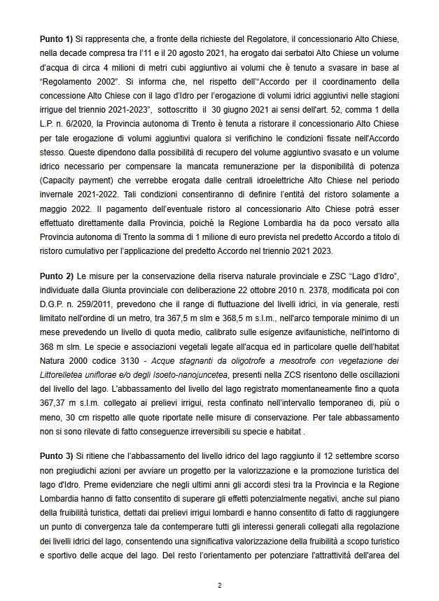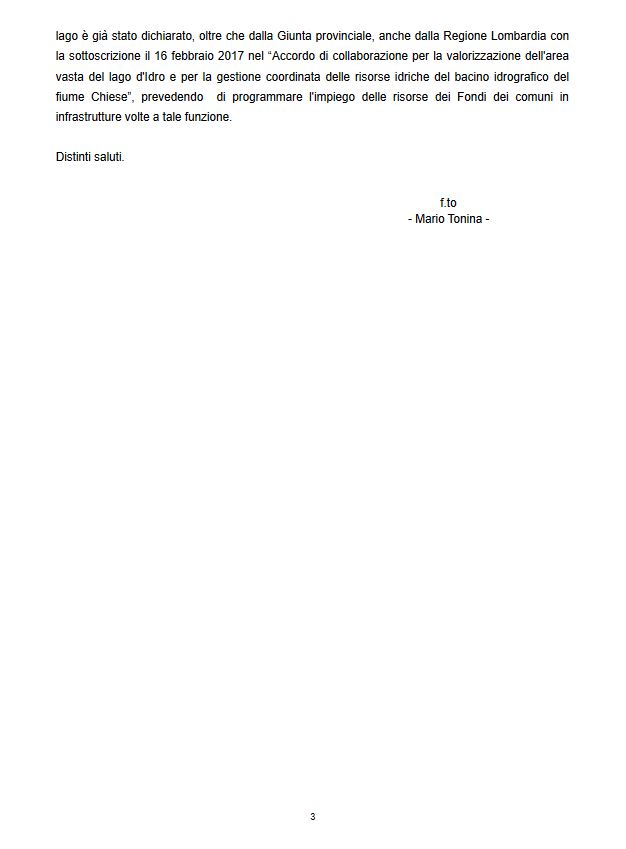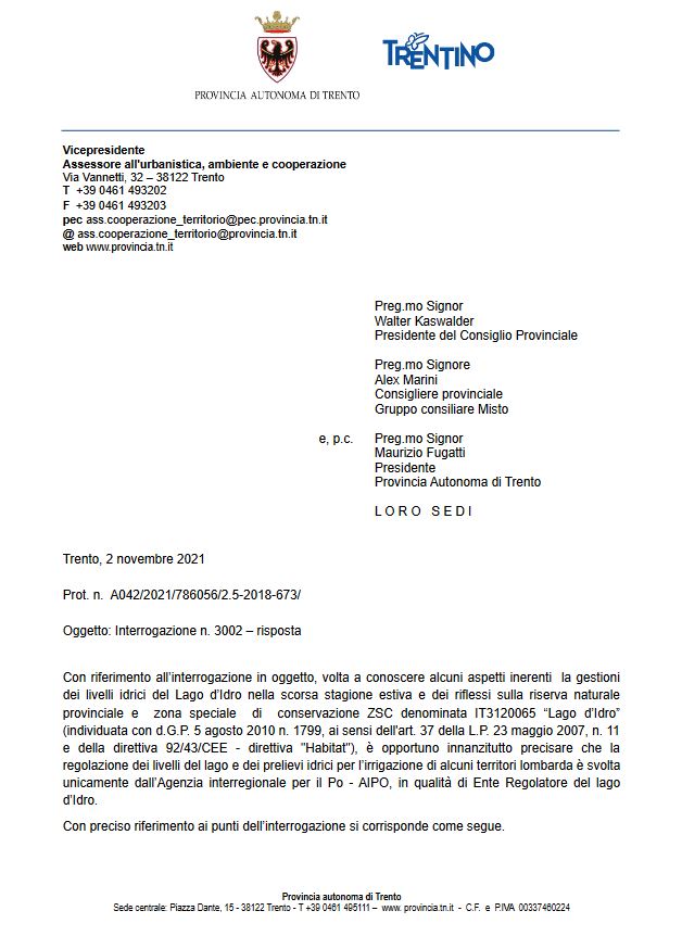Segue il testo della risposta all’interrogazione 3002/XVI a risposta scritta del 16 settembre “Prelievi idrici dal lado d’Idro ed effetti sulla conservazione del biotopo“