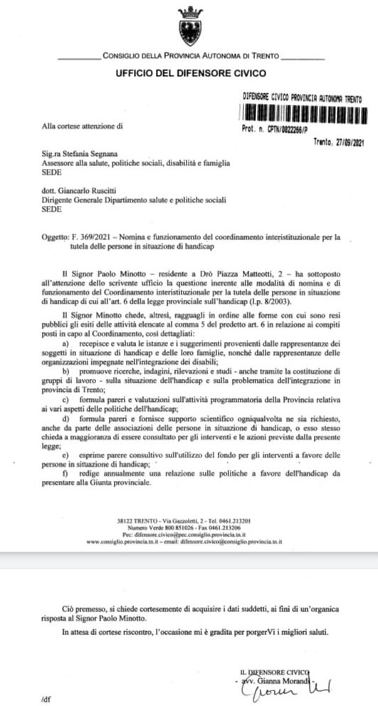 La situazione è la seguente. L’articolo 6 della legge provinciale sull’handicap n.8 del 2003 prevede che in Trentino operi il Coordinamento interistituzionale per la tutela delle persone in situazione di handicap. Si tratta di uno strumento nominato dalla giunta provinciale che dovrebbe, ad esempio, coordinare e integrare gli interventi a tutela e sostegno dei disabili, investigare la situazione delle persone affette da handicap in Provincia informandone la cittadinanza, valorizzare e promuovere progetti che favoriscano l’eguaglianza di opportunità pur in presenza di bisogni differenti, sviluppare iniziative innovative per migliorare la qualità dei servizi rivolti a chi si trova in situazione di handicap e molto altro ancora. Tante bellissime cose insomma, peccato che in concreto non si riesca a capire se e come vengano messe in pratica. È a tutti gli effetti un tema di assoluto rilievo, perché sarebbe proprio tramite questo Coordinamento che i disabili trentini dovrebbero trovare rappresentanza nelle istituzioni, avere la possibilità di far sentire la propria voce, segnalare esigenze e trovare risposte.