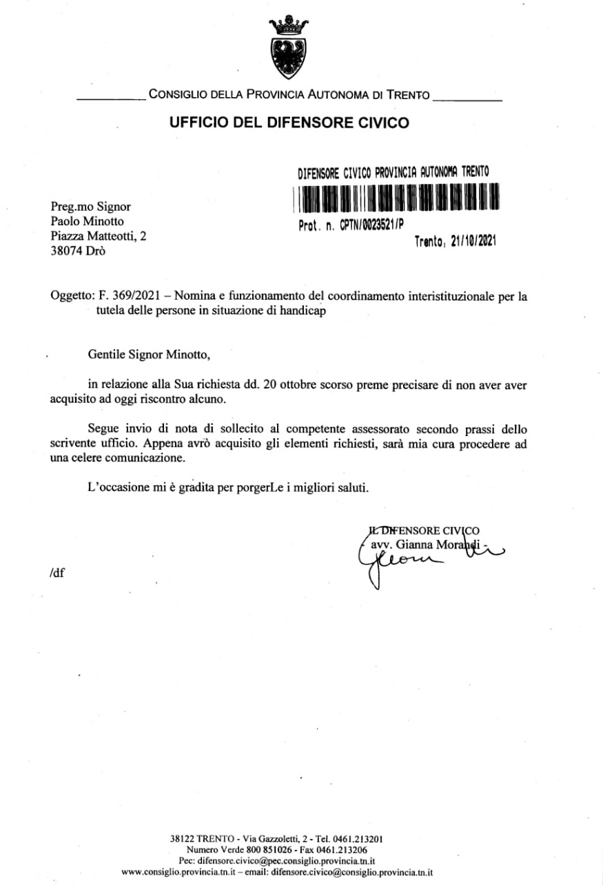 Chi scrive ha provato a capirci qualcosa, trovandosi però a rimbalzare contro il più classico dei muri di gomma. Da persona disabile, il mio scopo era di essere informato e partecipare attivamente alla vita pubblica ed in particolare a tutte le attività che mirano all’abbattimento degli ostacoli che impediscono ai disabili il godimento effettivo dei diritti dei disabili. Sono partito da un’interrogazione presentata dal consigliere provinciale Alex Marini nel maggio scorso, che in sostanza chiedeva lumi al presidente della Provincia proprio riguardo al Coordinamento a tutela delle persone affette da disabilità. Osservando come, pur a distanza di mesi, non ci fossero risposte, ho provato a procedere per mio conto, non riuscendo però a reperire informazioni rilevanti. Nel settembre scorso ho quindi chiesto al Difensore Civico, che è membro di diritto del Coordinamento stesso, di far luce sulla situazione. Ciò è effettivamente avvenuto, ma per ora né il direttore dell’azienda sanitaria provinciale e nemmeno l’assessore alla salute hanno ritenuto di rispondere, tanto che proprio in questi giorni il Difensore Civico ha provveduto ad inoltrare loro un sollecito. Si spera che le Autorità svelino presto l’arcano. A fronte della sconcertante mancanza di trasparenza che riguarda questo strumento pubblico, viene infatti da chiedersi, non tanto cosa abbia fatto il Coordinamento ma addirittura se esso esista davvero e, in caso, se si sia mai riunito.