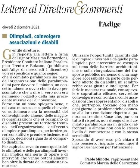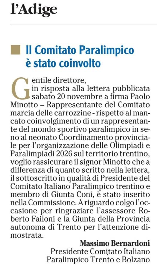 Gentile Direttore in risposta alla lettera pubblicata sul suo quotidiano in data 1 dicembre 2021 a firma del signor Massimo Bernardoni, Presidente Comitato Italiano Paralimpico Trento e Bolzano, vorrei specificare quanto segue: che il comitato paralimpico sia parte dell’organizzazione delle paralimpiadi mi pare davvero il minimo, un concetto talmente ovvio che lo davo per scontato e che a dire il vero non era nemmeno l’oggetto della mia precedente missiva datata 20 novembre.
